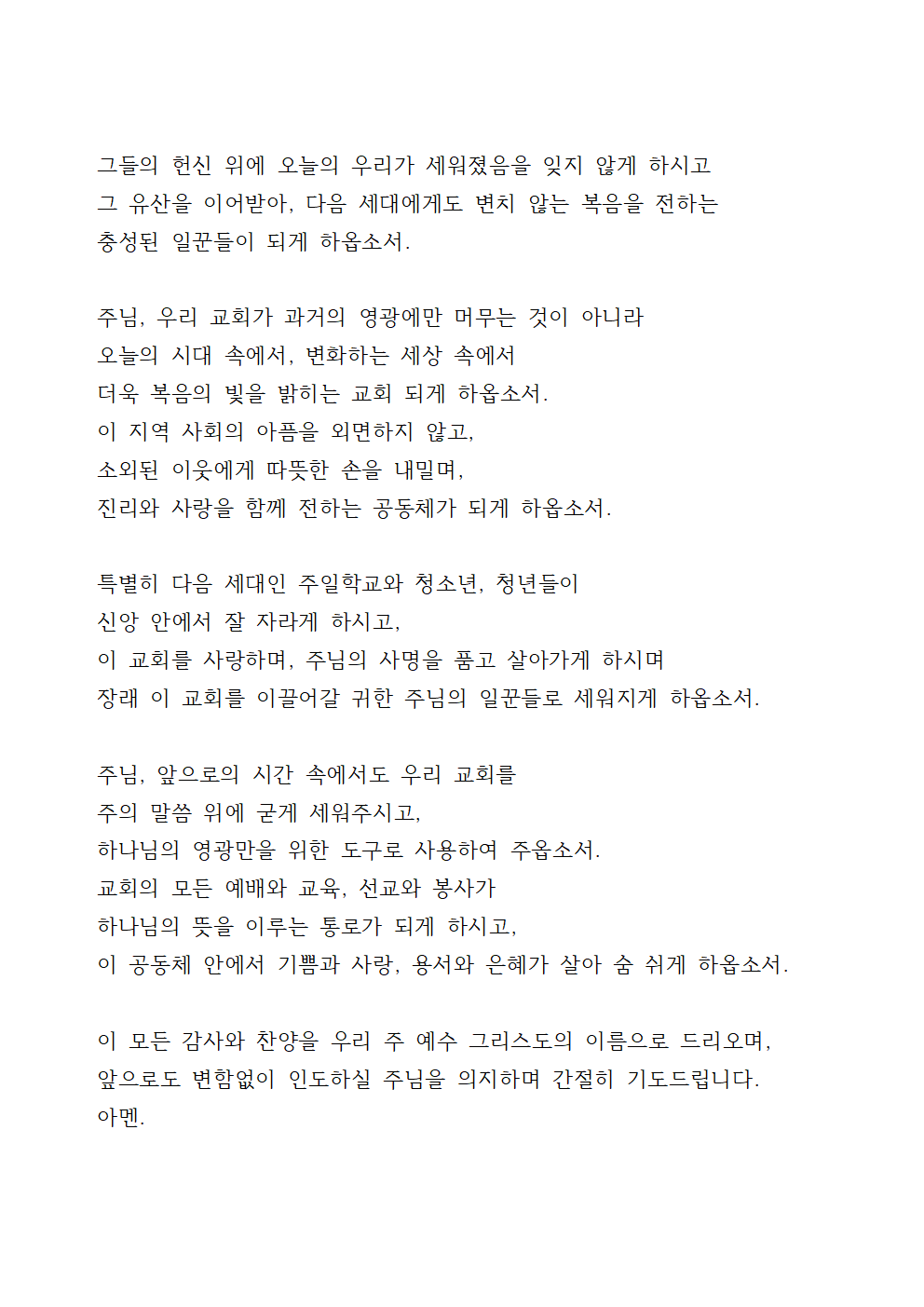 주님, 앞으로의 10년, 50년, 또 그 이후를 향해 나아가는 우리 교회가 더욱 하나님을 기쁘시게 하는 공동체가 되기를 간절히 원합니다. 사람을 의지하지 않고, 오직 말씀과 기도로 하나님을 의지하며, 진리 위에 굳게 서는 교회 되게 하옵소서. 세상의 변화 속에서도 본질을 지키고, 복음을 전파하는 데 힘쓰며, 사랑과 정의, 은혜와 섬김이 넘치는 공동체가 되게 하여 주옵소서.