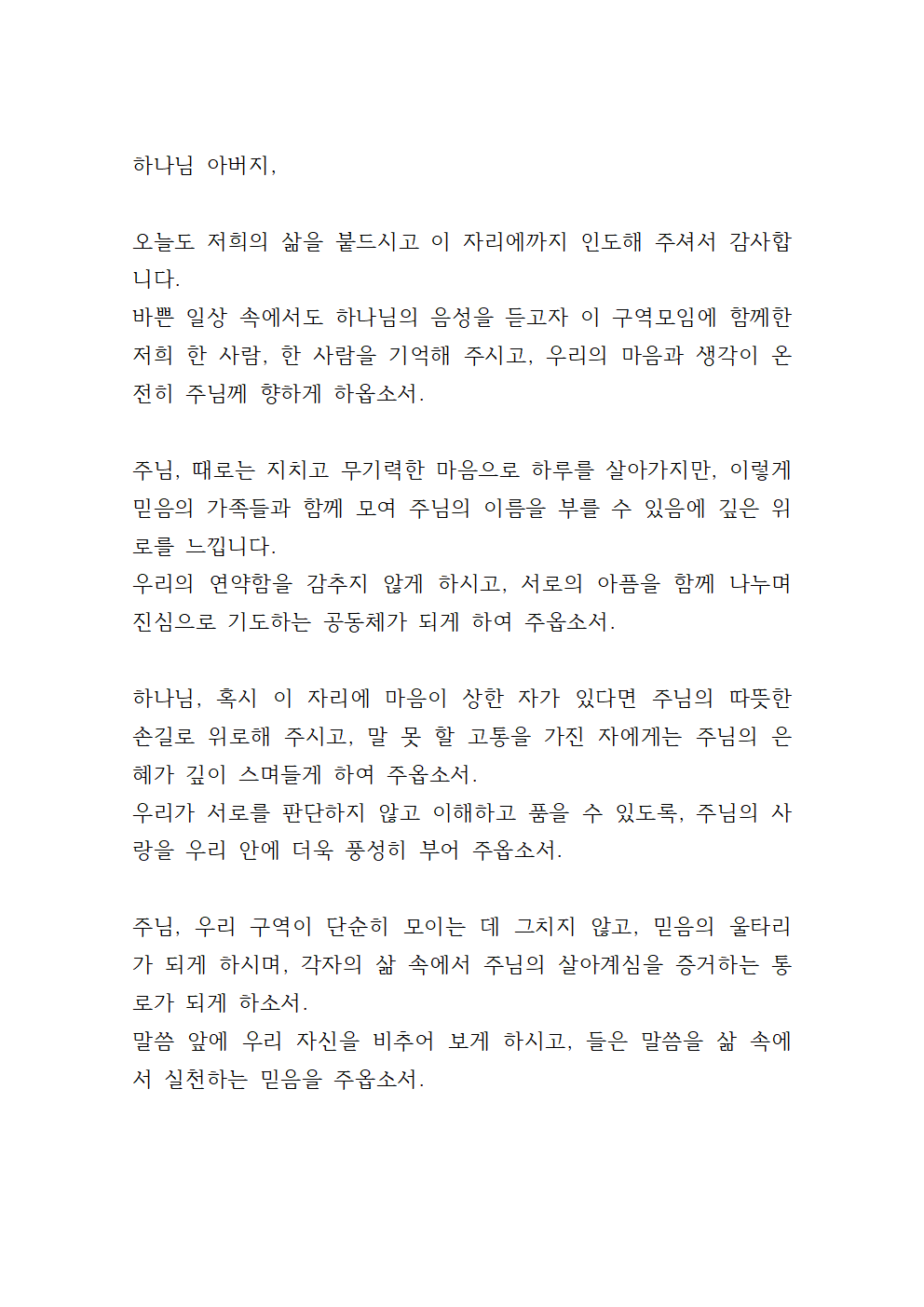 바쁜 일상 속에서도 하나님의 음성을 듣고자 이 구역모임에 함께한 저희 한 사람, 한 사람을 기억해 주시고, 우리의 마음과 생각이 온전히 주님께 향하게 하옵소서.