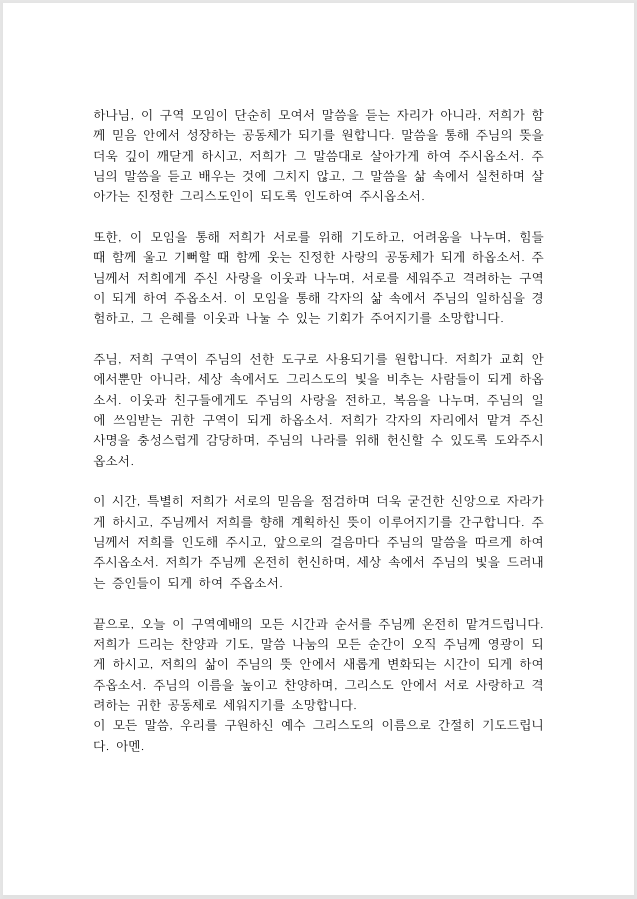 하나님, 이 구역 모임이 단순히 모여서 말씀을 듣는 자리가 아니라, 저희가 함께 믿음 안에서 성장하는 공동체가 되기를 원합니다. 말씀을 통해 주님의 뜻을 더욱 깊이 깨닫게 하시고, 저희가 그 말씀대로 살아가게 하여 주시옵소서. 주님의 말씀을 듣고 배우는 것에 그치지 않고, 그 말씀을 삶 속에서 실천하며 살아가는 진정한 그리스도인이 되도록 인도하여 주시옵소서.