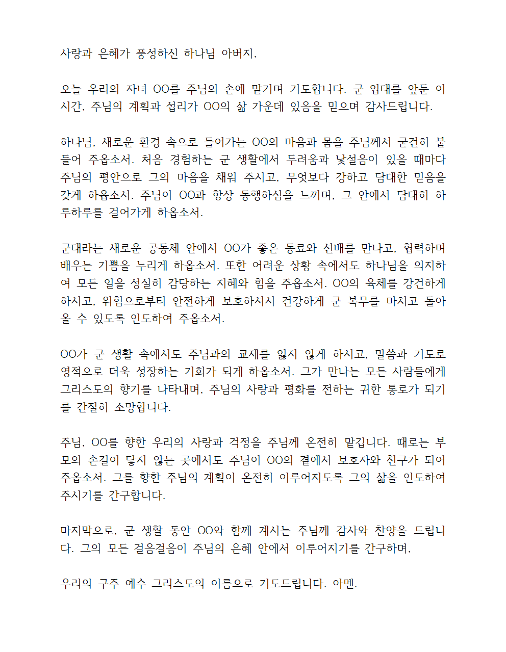 군대라는 새로운 공동체 안에서 OO가 좋은 동료와 선배를 만나고, 협력하며 배우는 기쁨을 누리게 하옵소서. 또한 어려운 상황 속에서도 하나님을 의지하여 모든 일을 성실히 감당하는 지혜와 힘을 주옵소서. OO의 육체를 강건하게 하시고, 위험으로부터 안전하게 보호하셔서 건강하게 군 복무를 마치고 돌아올 수 있도록 인도하여 주옵소서.