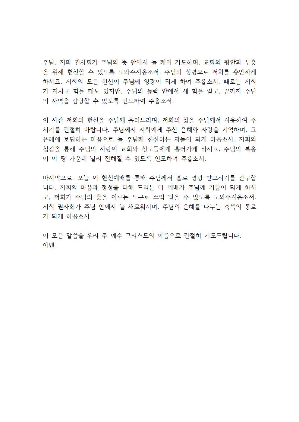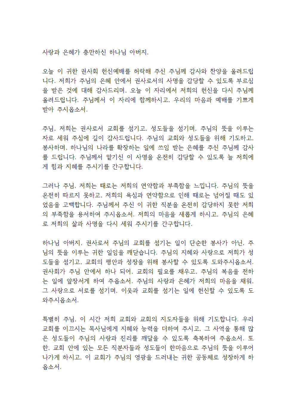 마지막으로, 오늘 이 헌신예배를 통해 주님께서 홀로 영광 받으시기를 간구합니다. 저희의 마음과 정성을 다해 드리는 이 예배가 주님께 기쁨이 되게 하시고, 저희가 주님의 뜻을 이루는 도구로 쓰임 받을 수 있도록 도와주시옵소서. 저희 권사회가 주님 안에서 늘 새로워지며, 주님의 은혜를 나누는 축복의 통로가 되게 하옵소서.
