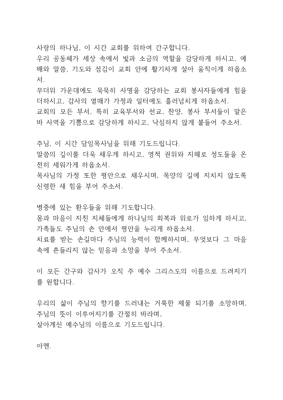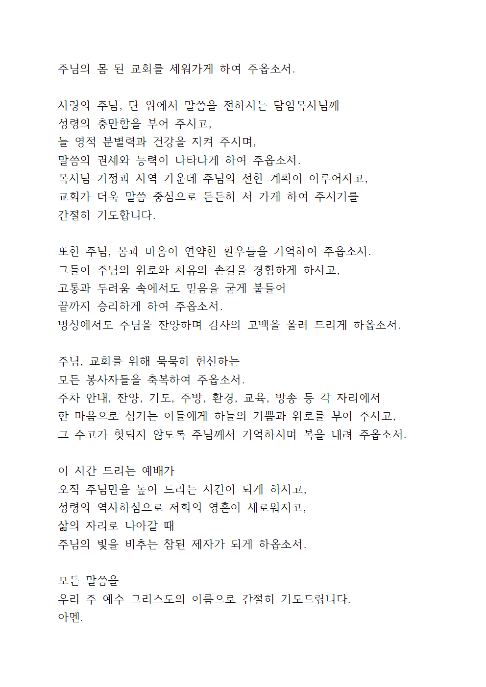 우리 교회가 지역과 세상을 향한 복음의 통로가 되게 하시고, 사랑과 섬김으로 하나님의 나라를 확장하는 공동체가 되게 하옵소서.