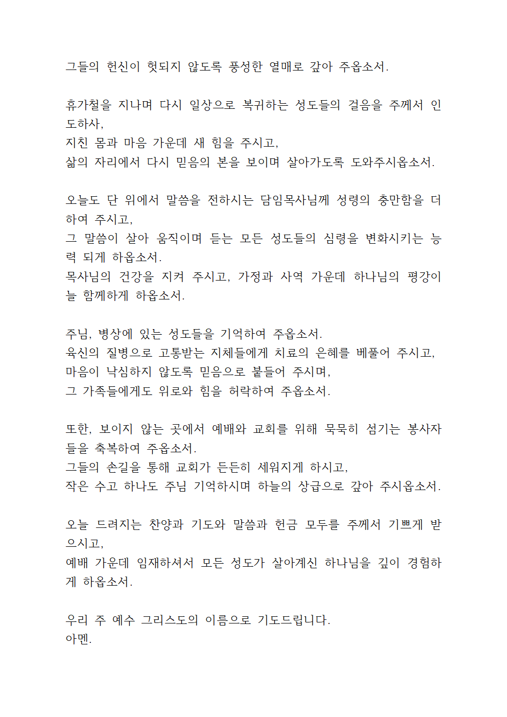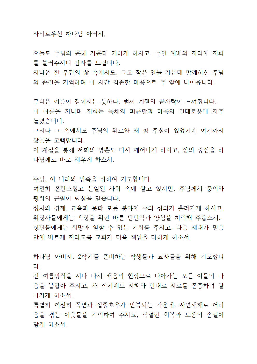 여름의 뜨거운 햇살 속에서도 저희를 지켜 주시고, 주님의 전으로 불러 주셔서 예배드리게 하시니 감사드립니다.