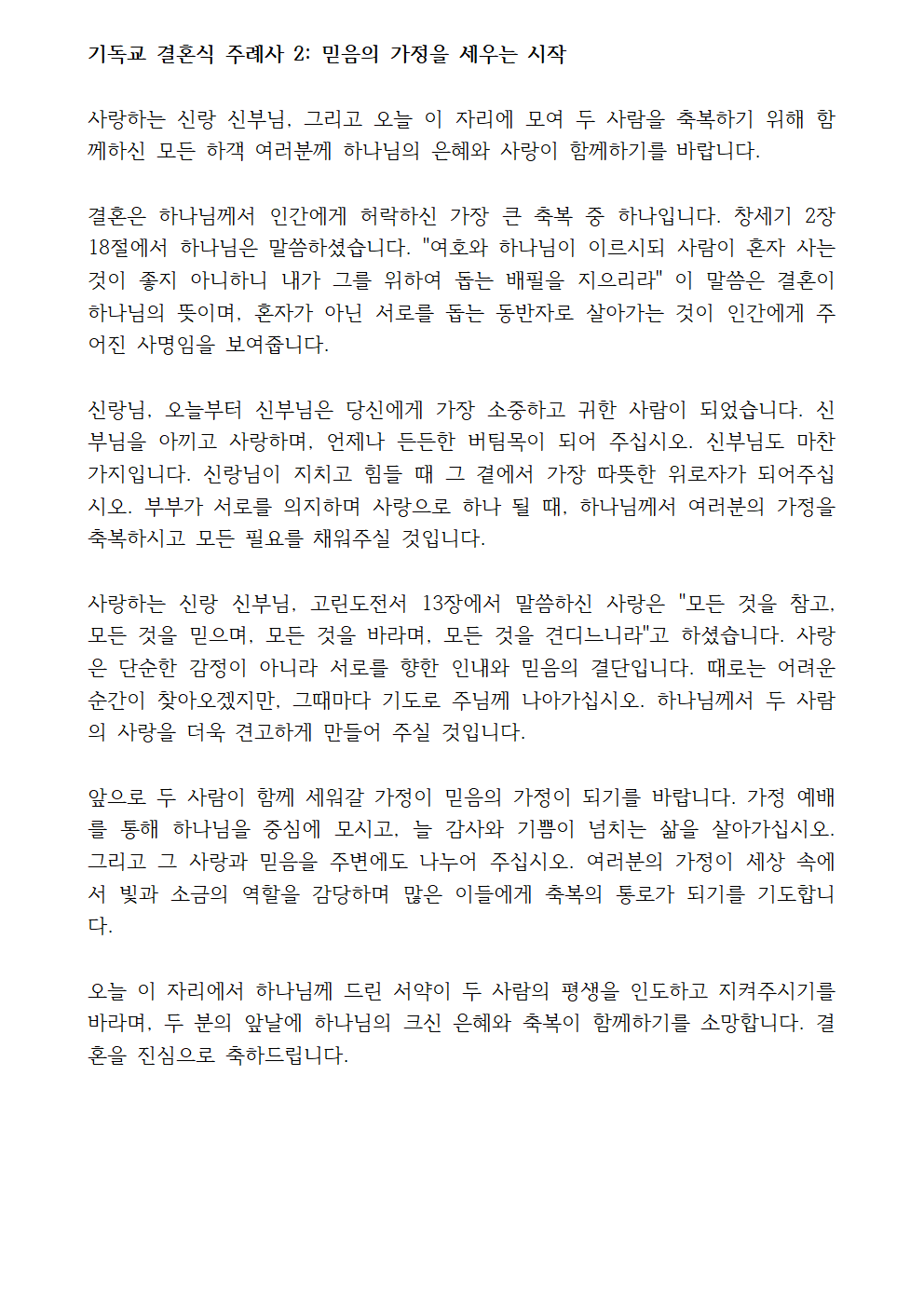 오늘은 기독교식 결혼식 주례사에 대해서 안내해 드렸습니다. 신랑, 신부가 기독교적인 말씀 안에서 행복한 결혼 생활을 해나가길 바라는 마음에서 작성된 주례사입니다.
