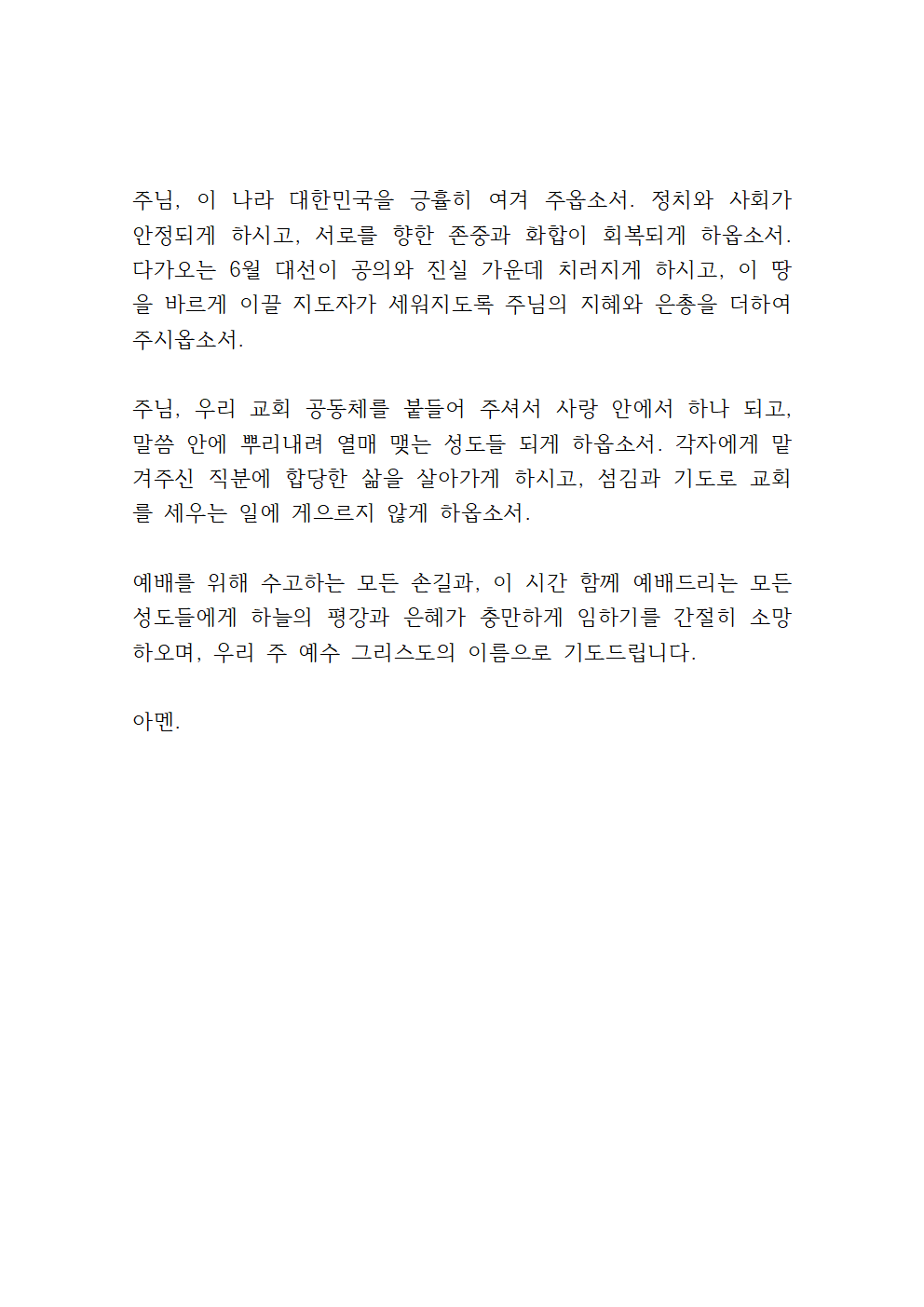 주님, 다음 주에는 우리나라의 중요한 대선이 있습니다. 이 나라를 불쌍히 여겨 주시고, 지도자 한 사람을 통해 하나님의 뜻이 이 땅에 이뤄지도록 도와주시옵소서. 백성들의 마음에 지혜와 분별을 허락하셔서 정직하고 국민을 섬길 줄 아는 자가 세워지게 하옵소서. 대립과 갈등이 아닌 화합과 회복이 이뤄지는 나라가 되도록 하나님의 손으로 인도하여 주시옵소서.