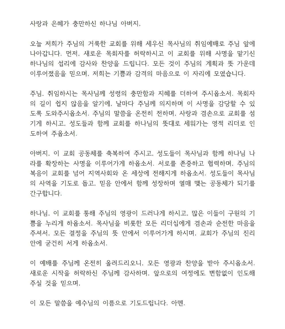 이번 기도문은 목사 취임예배를 통해 새로운 목회자가 주님의 뜻에 따라 사역할 수 있기를 기도하며, 교회와 성도들이 함께 협력하여 하나님의 나라를 확장하기를 간구하고 있습니다.