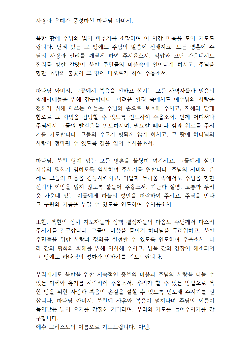 북한 선교를 위한 기도문 내용