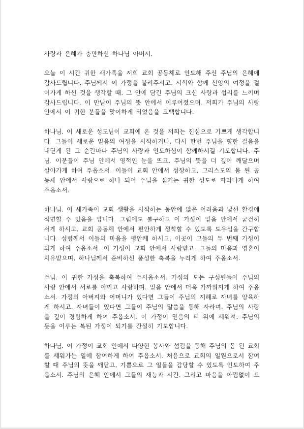 하나님, 이 새가족이 교회 생활을 시작하는 동안에 많은 어려움과 낯선 환경에 직면할 수 있음을 압니다. 그럼에도 불구하고 이 가정이 믿음 안에서 굳건히 서게 하시고, 교회 공동체 안에서 편안하게 정착할 수 있도록 도우심을 간구합니다. 성령께서 이들의 마음을 평안케 하시고, 이곳이 그들의 두 번째 가정이 되게 하여 주옵소서. 이 가정이 교회 안에서 사랑받고, 그들의 마음과 영혼이 치유받으며, 하나님께서 준비하신 풍성한 축복을 누리게 하여 주옵소서.