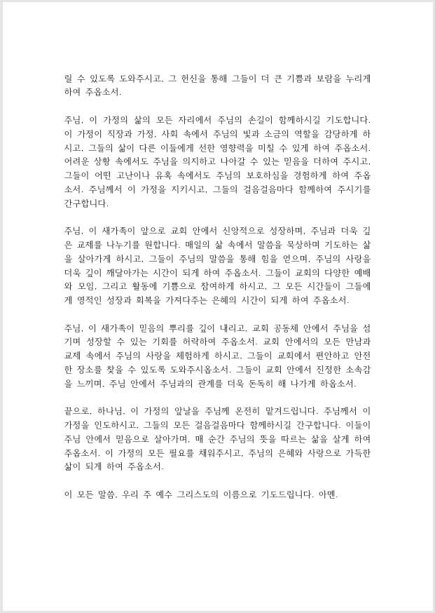 끝으로, 하나님, 이 가정의 앞날을 주님께 온전히 맡겨드립니다. 주님께서 이 가정을 인도하시고, 그들의 모든 걸음걸음마다 함께하시길 간구합니다. 이들이 주님 안에서 믿음으로 살아가며, 매 순간 주님의 뜻을 따르는 삶을 살게 하여 주옵소서. 이 가정의 모든 필요를 채워주시고, 주님의 은혜와 사랑으로 가득한 삶이 되게 하여 주옵소서.