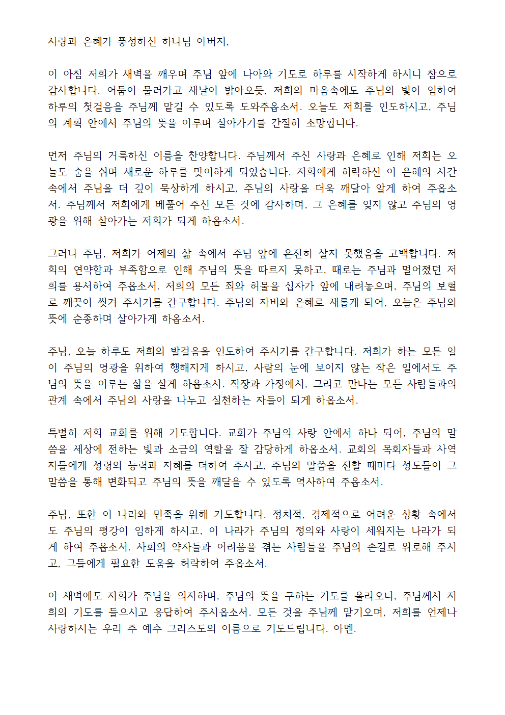이 기도문은 새벽기도회를 통해 하루를 주님께 맡기며, 감사와 찬양을 드리고, 우리의 죄를 회개하며, 주님의 인도하심을 구하는 내용을 담고 있습니다. 또한, 교회와 세상을 위한 중보기도와 개인의 신앙 성숙을 위한 간구가 포함되어 있습니다.