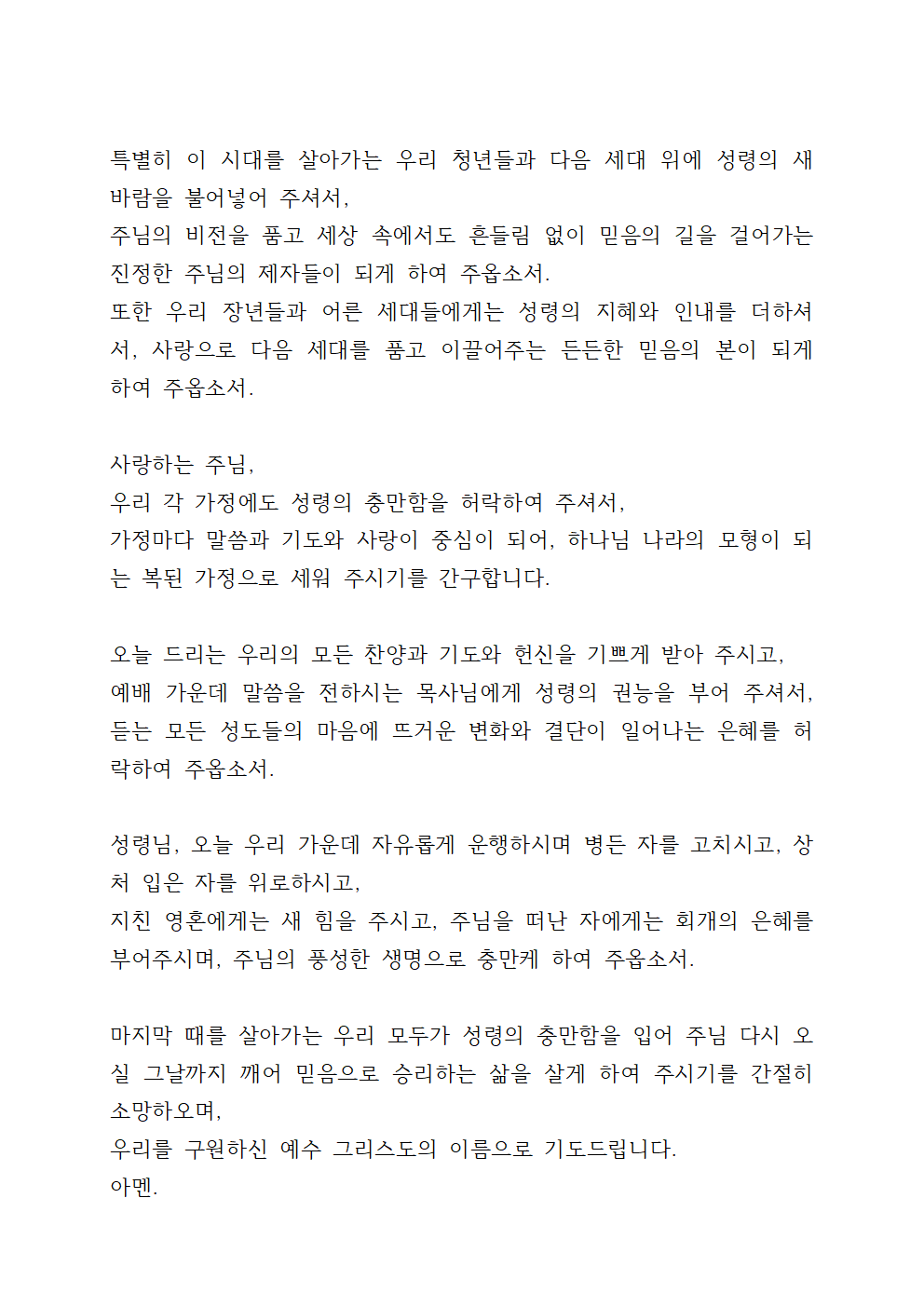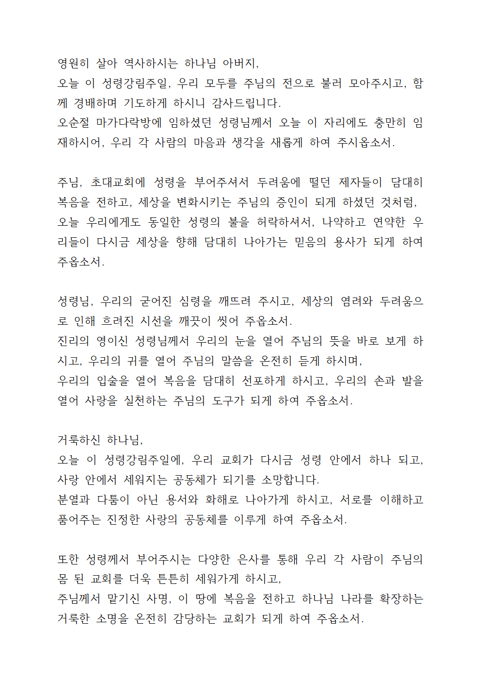 오늘 이 성령강림절에, 주님께 간구합니다. 우리의 가정마다 성령의 평강이 넘치게 하시고, 우리 교회마다 성령의 능력이 가득 차게 하시며, 이 나라와 민족 위에도 성령의 새 바람을 불어 주셔서 진리와 사랑이 넘치는 땅으로 변화되게 하여 주옵소서.