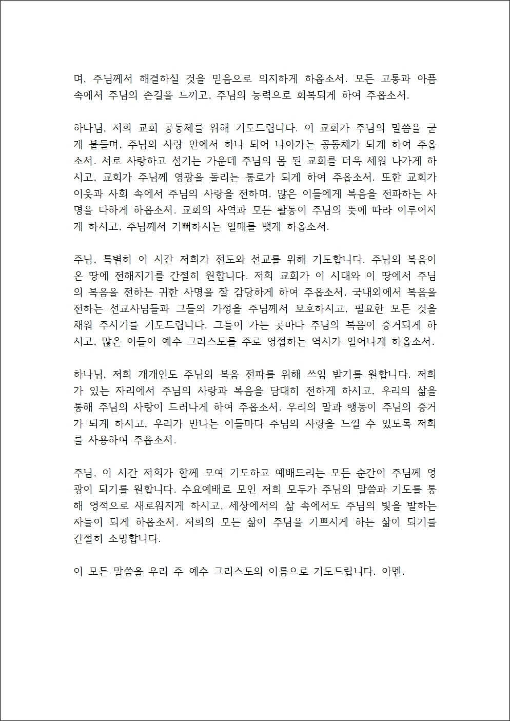 이 기도문은 예배를 통해 하나님의 말씀을 듣고 그 뜻을 깨닫는 시간, 성도들의 필요와 간구를 올리는 시간, 그리고 교회의 성장과 복음 전파를 위해 기도하는 내용을 담고 있습니다.