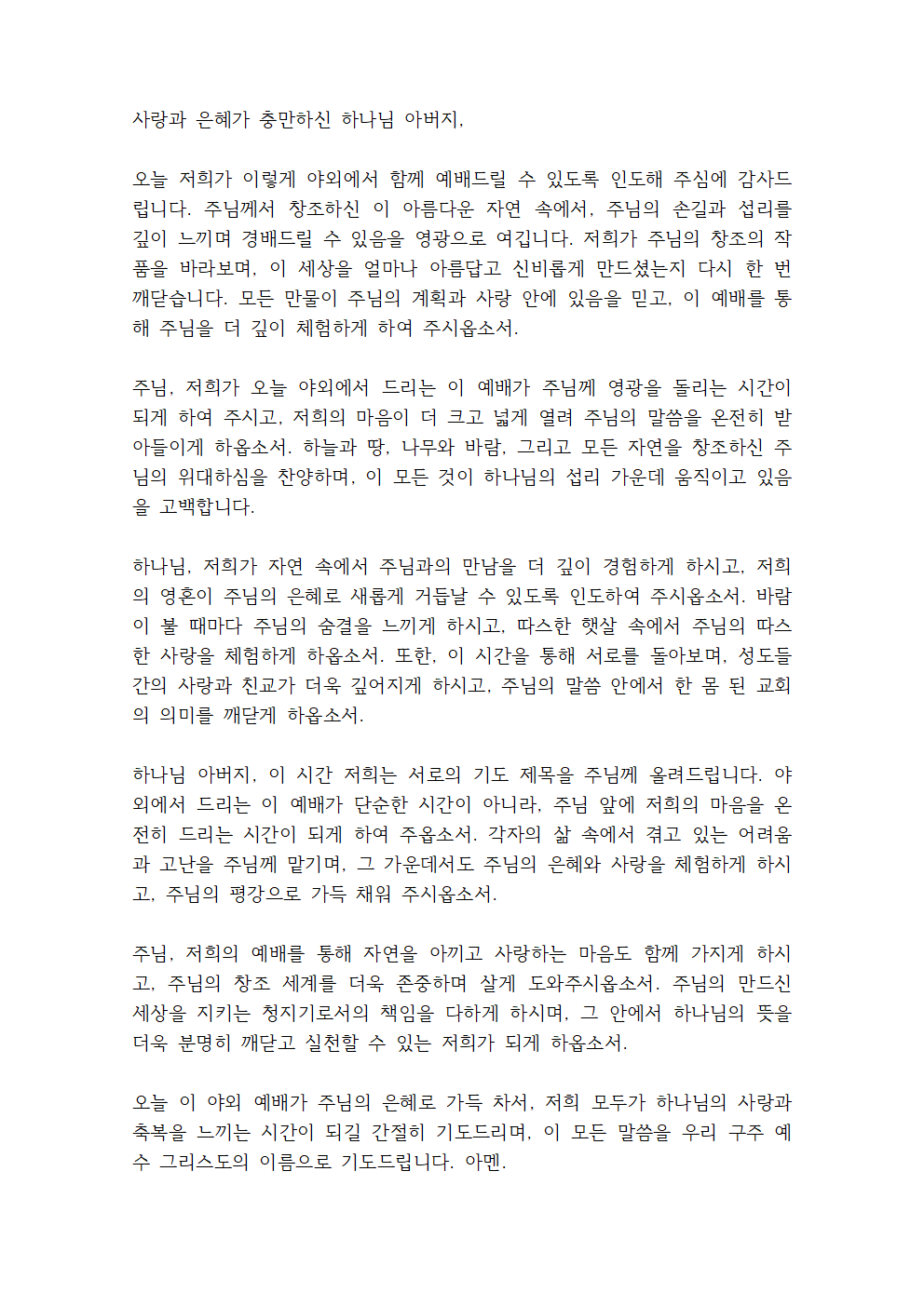 오늘 이 야외 예배가 주님의 은혜로 가득 차서, 저희 모두가 하나님의 사랑과 축복을 느끼는 시간이 되길 간절히 기도드리며, 이 모든 말씀을 우리 구주 예수 그리스도의 이름으로 기도드립니다. 아멘.