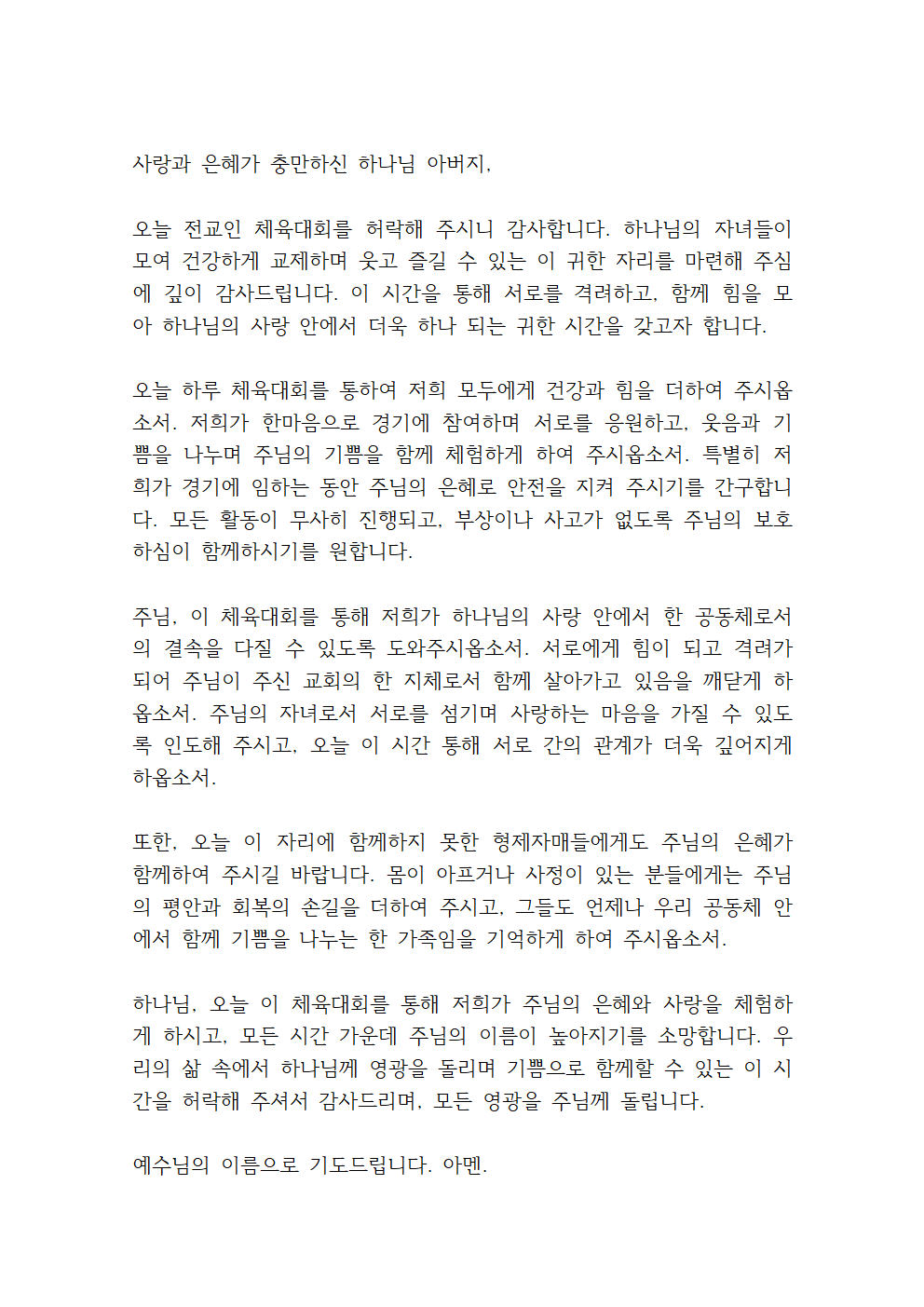 이번 기도문은 전교인 체육대회가 하나님의 보호하심과 은혜 속에서 이루어지기를 바라며, 성도들이 주 안에서 화합하고 서로의 관계가 깊어지기를 간구하는 내용을 담고 있습니다.