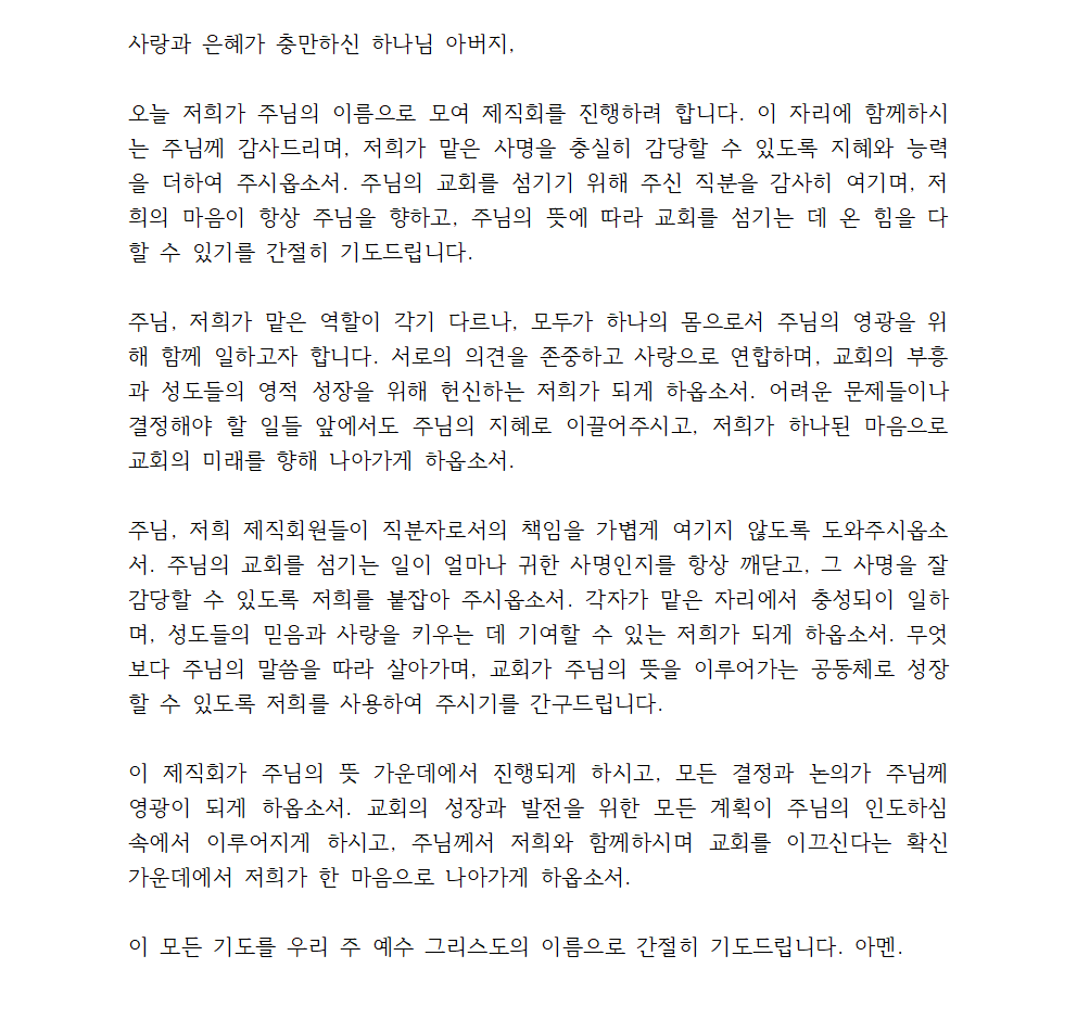 이번 글에서는 제직회로 모일 때 기도하는 제직회 대표기도문을 안내해 드리겠습니다.