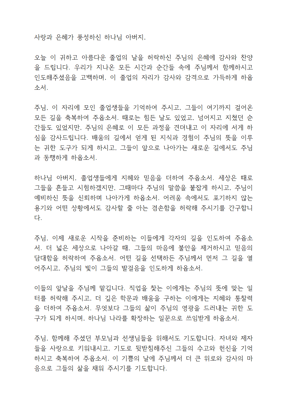 마지막으로 이 졸업식을 통해 영광받으실 주님께 감사드립니다. 우리 모두의 시작과 끝이 되시는 주님을 찬양하며, 앞으로의 모든 시간도 주님께 맡깁니다.