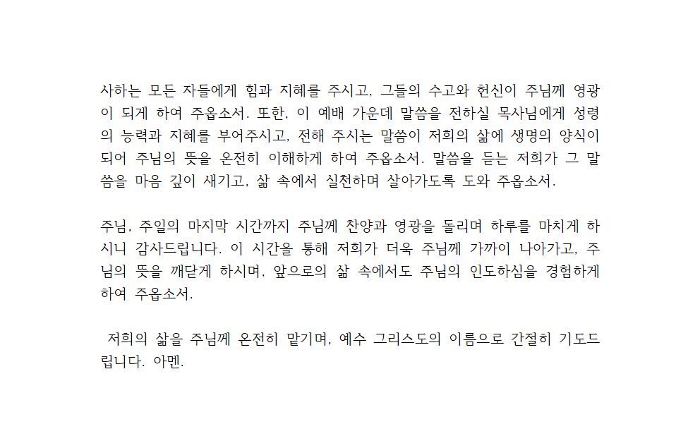 이번 기도문은 주일 하루 동안 주신 은혜에 감사드리고, 회개와 함께 새로운 한 주의 시작을 위해 하나님의 인도와 보호를 구하는 내용입니다. 예배 봉사자들과 교회를 위한 중보기도가 포함되어 있으며, 하나님의 평강 속에 한 주를 준비하는 마음을 담고 있습니다.