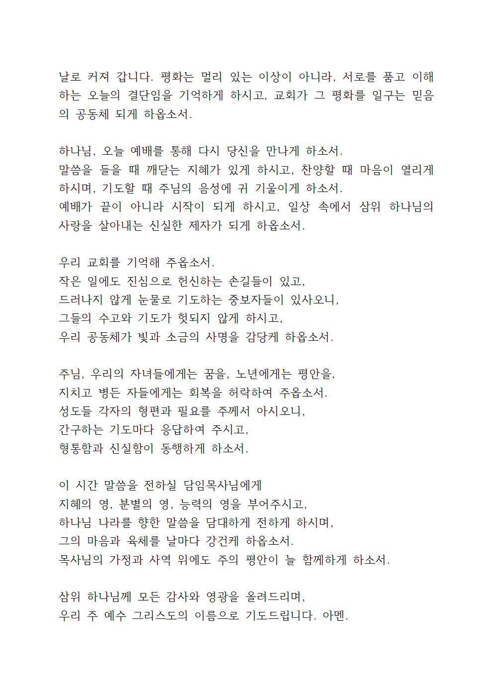 이 땅 위에 세워진 교회들이 먼저 평화의 복음을 전하게 하시고, 진영을 넘어서는 그리스도의 십자가로 연합의 모범이 되게 하옵소서. 특히, 우리 세대뿐만 아니라 다음 세대가 이 나라를 위해 기도하며 바르게 살아갈 수 있는 믿음의 토양이 준비되게 하시고, 분주한 일상과 정보의 홍수 속에서도 하나님의 뜻을 분별하며 살아가는 영적 민감성과 중심을 갖게 하옵소서.
