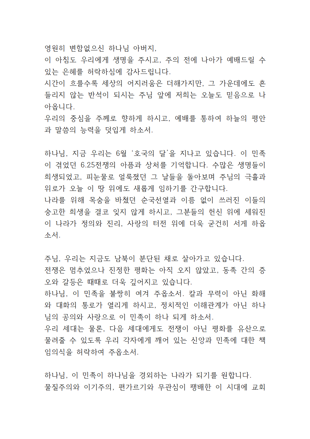 6월은 호국보훈의 달로 나라를 위해 기도하는 것이 꼭 필요한 시점입니다.