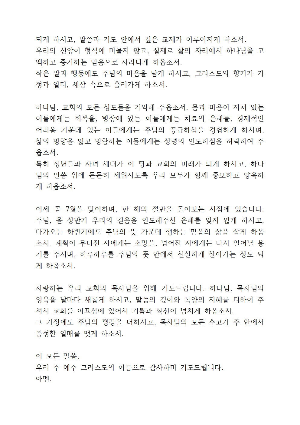 이제 곧 7월을 맞이하며, 한 해의 절반을 돌아보는 시점에 있습니다. 주님, 올 상반기 우리의 걸음을 인도해 주신 은혜를 잊지 않게 하시고, 다가오는 하반기에도 주님의 뜻 가운데 행하는 믿음의 삶을 살게 하옵소서. 계획이 무너진 자에게는 소망을, 넘어진 자에게는 다시 일어날 용기를 주시며, 하루하루를 주님의 뜻 안에서 신실하게 살아가는 성도 되게 하옵소서.