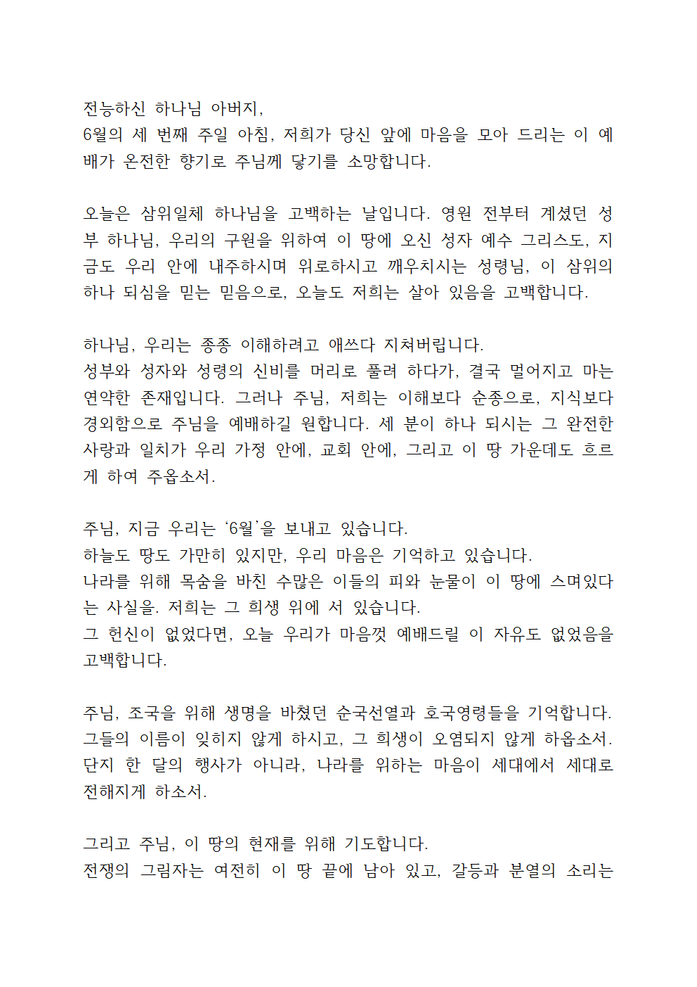 하나님, 6월 한 달 동안 저희가 ‘호국의 달’을 지내며 이 땅의 아픔과 전쟁의 상처를 다시금 되새기게 하심에 감사를 드립니다. 6.25 전쟁의 참상 속에서도 이 나라를 지켜주셨고, 수많은 생명들의 희생 위에 오늘의 자유와 평화를 누릴 수 있게 하신 하나님, 그 은혜를 결코 잊지 않게 하시고, 진정한 감사와 책임의 삶으로 살아가는 성도 되게 하옵소서.