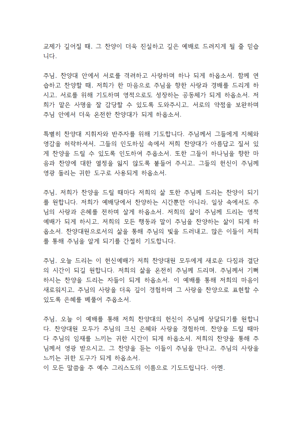 '찬양대 헌신예배 기도문 (성가대)'