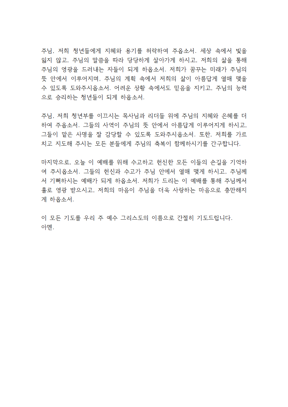 주님, 저희 청년들에게 지혜와 용기를 허락하여 주옵소서. 세상 속에서 빛을 잃지 않고, 주님의 말씀을 따라 당당하게 살아가게 하시고, 저희의 삶을 통해 주님의 영광을 드러내는 자들이 되게 하옵소서. 저희가 꿈꾸는 미래가 주님의 뜻 안에서 이루어지며, 주님의 계획 속에서 저희의 삶이 아름답게 열매 맺을 수 있도록 도와주시옵소서. 어려운 상황 속에서도 믿음을 지키고, 주님의 능력으로 승리하는 청년들이 되게 하옵소서.