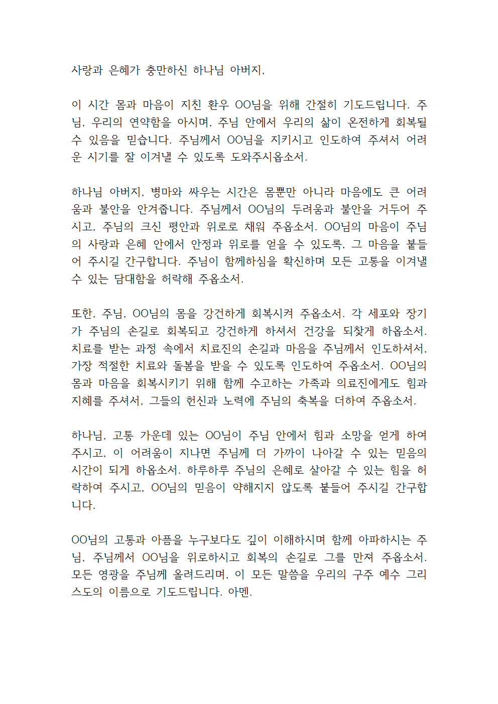 하나님께서 OO님을 돌보시고 그분의 아픔을 치유해 주시길 간구하며, OO님이 이 어려운 시간 속에서도 주님의 위로와 소망을 붙들며 하루하루를 이겨나가도록 힘을 구하는 내용입니다.