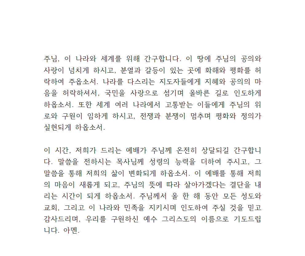 주님, 이 나라와 세계를 위해 간구합니다. 이 땅에 주님의 공의와 사랑이 넘치게 하시고, 분열과 갈등이 있는 곳에 화해와 평화를 허락하여 주옵소서. 나라를 다스리는 지도자들에게 지혜와 공의의 마음을 허락하셔서, 국민을 사랑으로 섬기며 올바른 길로 인도하게 하옵소서. 또한 세계 여러 나라에서 고통받는 이들에게 주님의 위로와 구원이 임하게 하시고, 전쟁과 분쟁이 멈추며 평화와 정의가 실현되게 하옵소서.