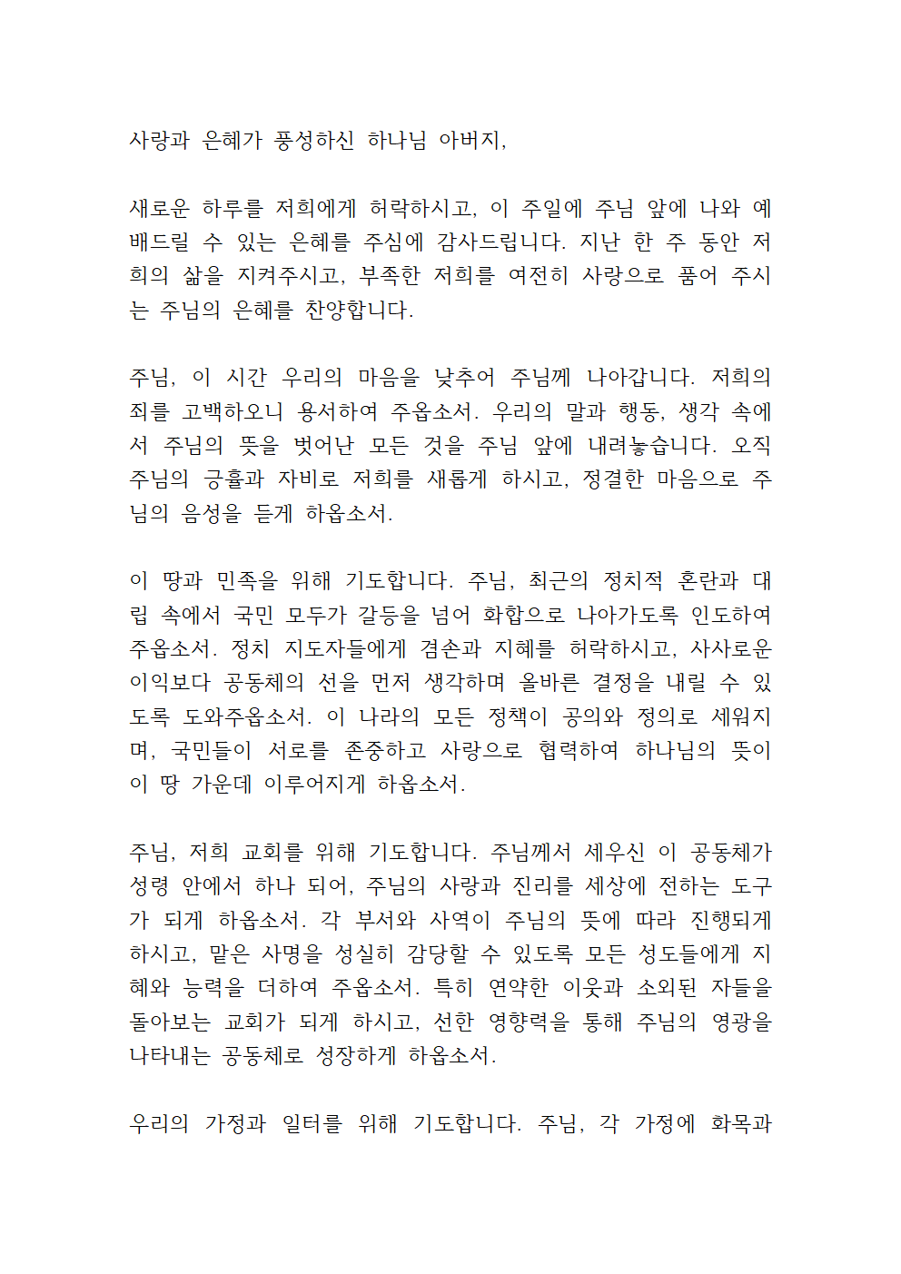새로운 하루를 저희에게 허락하시고, 이 주일에 주님 앞에 나와 예배드릴 수 있는 은혜를 주심에 감사드립니다. 지난 한 주 동안 저희의 삶을 지켜주시고, 부족한 저희를 여전히 사랑으로 품어 주시는 주님의 은혜를 찬양합니다.