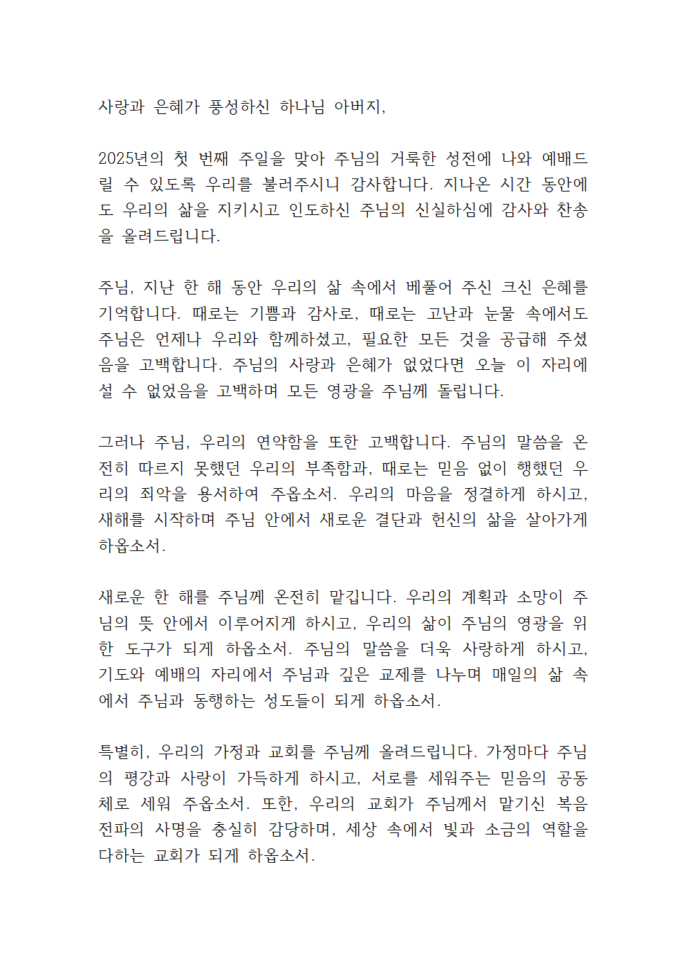2025년의 첫 번째 주일을 맞아 주님의 거룩한 성전에 나와 예배드릴 수 있도록 우리를 불러주시니 감사합니다. 지나온 시간 동안에도 우리의 삶을 지키시고 인도하신 주님의 신실하심에 감사와 찬송을 올려드립니다.
