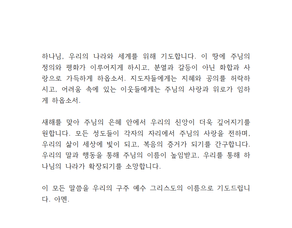 따라서 이번 기도문은 교회와 성도들이 하나 되어 하나님 앞에서 새롭게 다짐하고, 개인과 공동체, 그리고 세상을 위한 간구를 드리는 내용으로 구성했습니다.