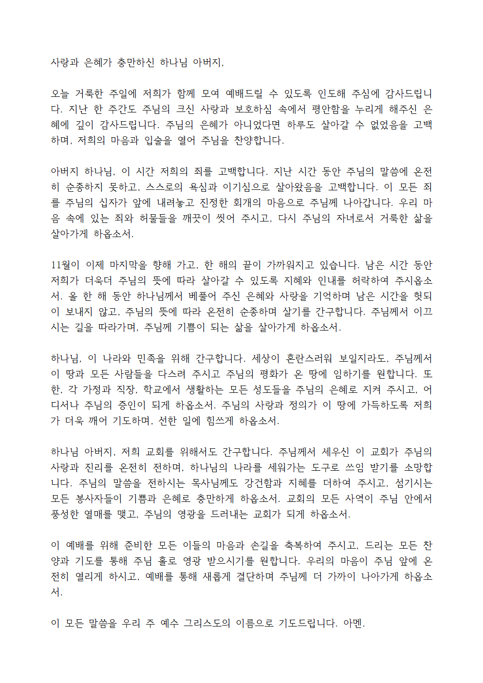 ※ 다음은 11월 셋째주일 대표기도문입니다. 필요하실 때 함께 사용해 보세요.