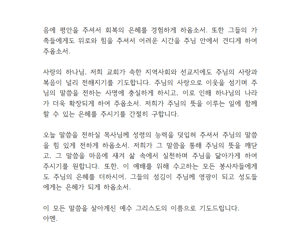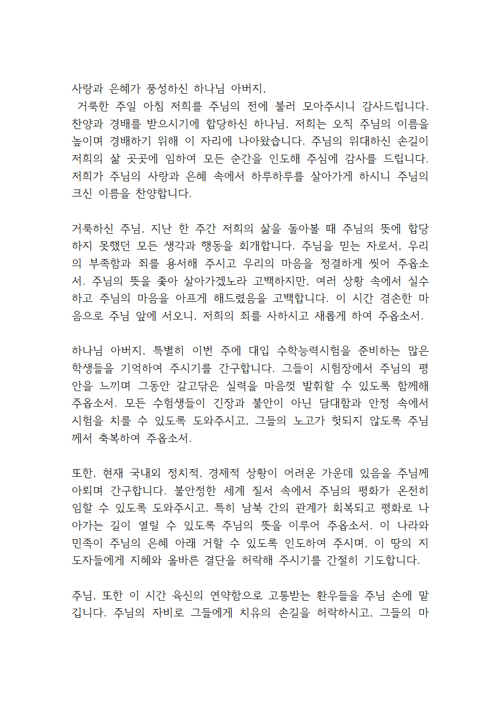 이번 기도문은 11월 둘째 주일 예배에서 대입 수험생들과 국가와 세계의 평화를 위한 간구, 회개와 감사, 환우와 지역사회 및 선교지의 은혜를 기원하는 내용을 담고 있습니다.