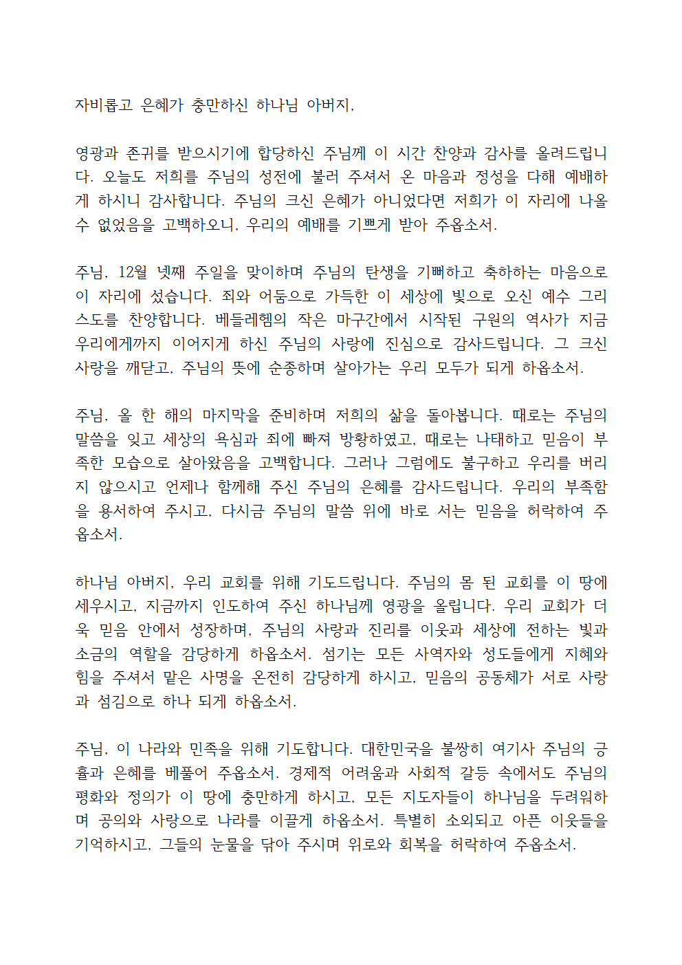 12월 넷째주일 대표기도문 내용