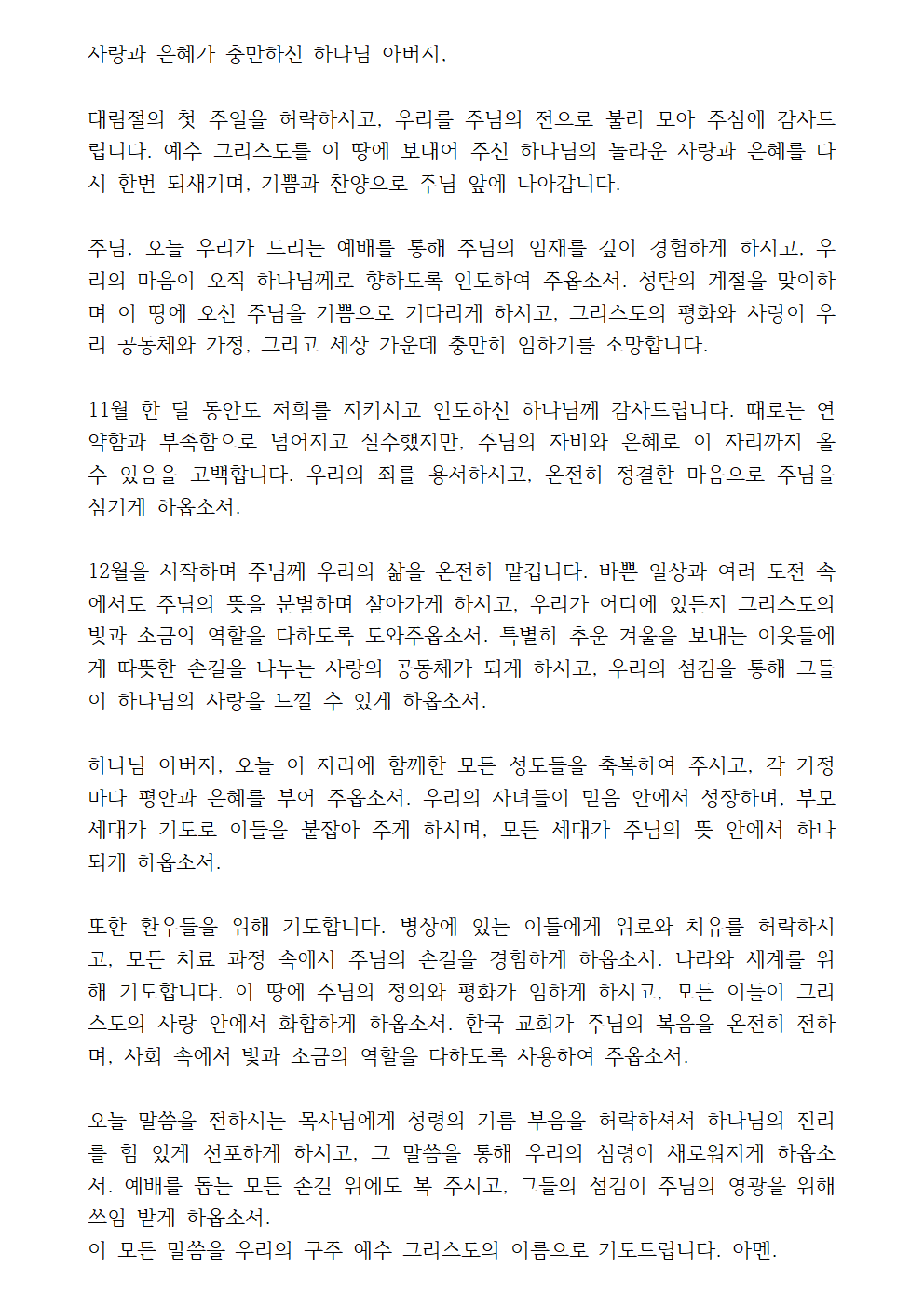 12월 첫째주일 대표기도문 맺음말