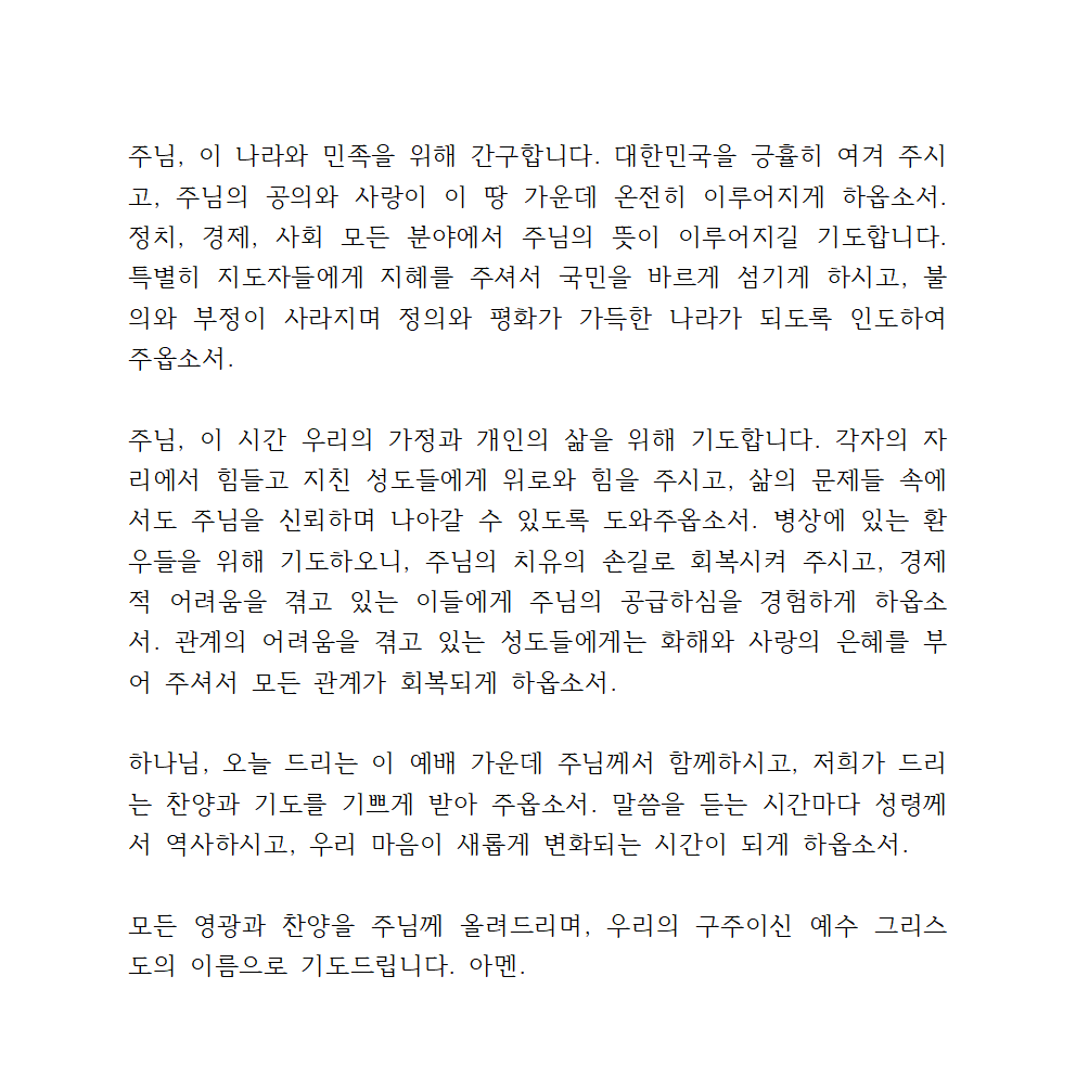 주님, 이 나라와 민족을 위해 간구합니다. 대한민국을 긍휼히 여겨 주시고, 주님의 공의와 사랑이 이 땅 가운데 온전히 이루어지게 하옵소서. 정치, 경제, 사회 모든 분야에서 주님의 뜻이 이루어지길 기도합니다. 특별히 지도자들에게 지혜를 주셔서 국민을 바르게 섬기게 하시고, 불의와 부정이 사라지며 정의와 평화가 가득한 나라가 되도록 인도하여 주옵소서.