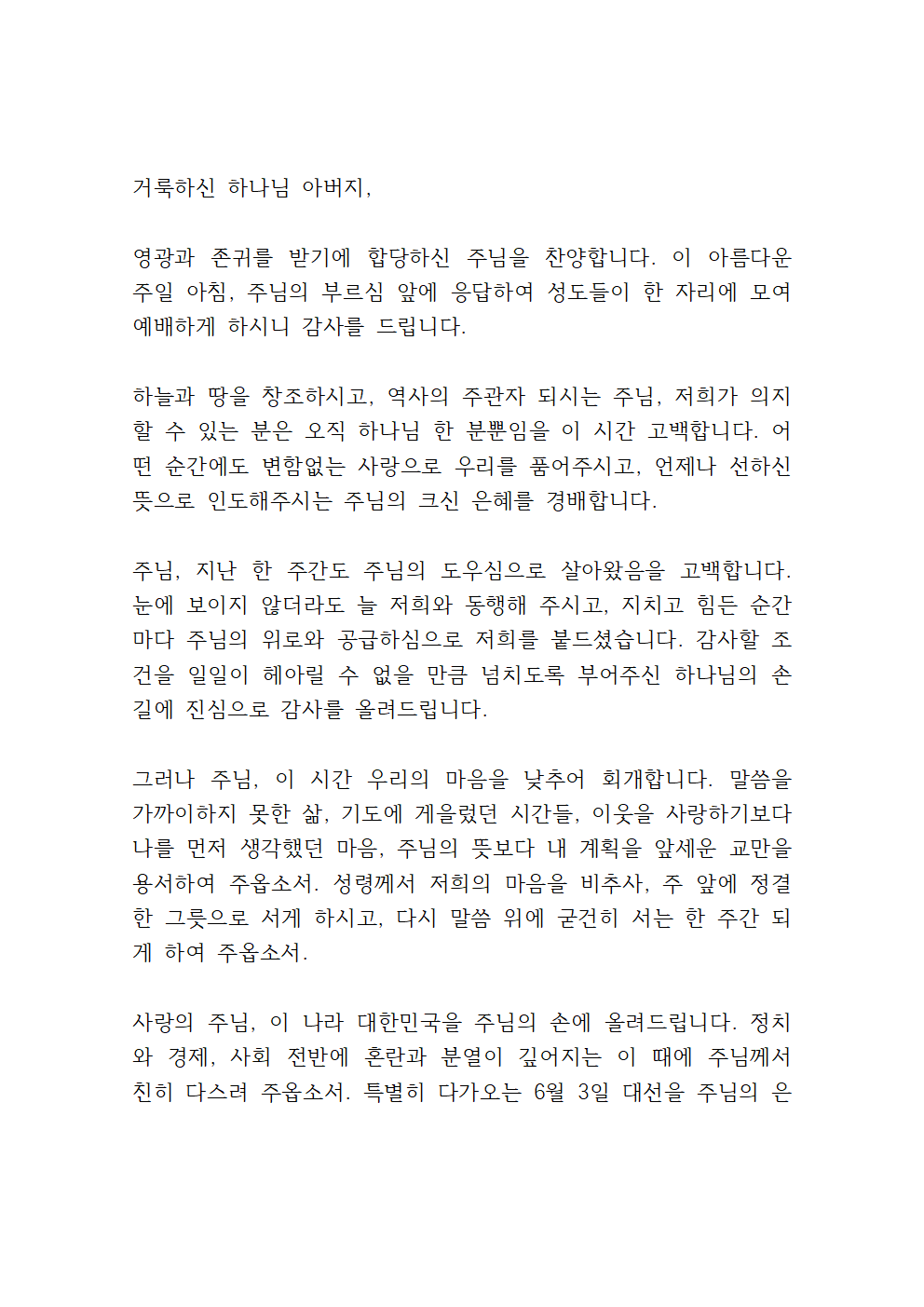 사랑의 주님, 이 나라 대한민국을 주님의 손에 올려드립니다. 정치와 경제, 사회 전반에 혼란과 분열이 깊어지는 이때에 주님께서 친히 다스려 주옵소서. 특별히 다가오는 6월 3일 대선을 주님의 은혜 가운데 맡겨 드리오니, 공의와 지혜가 있는 지도자가 세워지게 하시고, 국민 모두가 진실함으로 참여하며, 화합과 안정의 길로 나아가도록 인도하여 주옵소서.