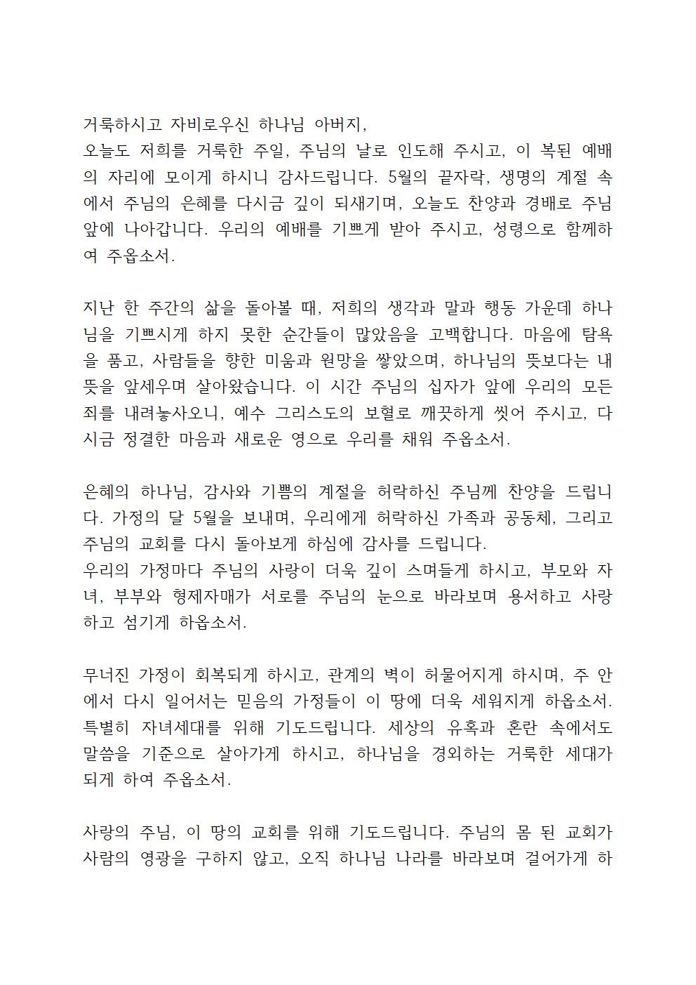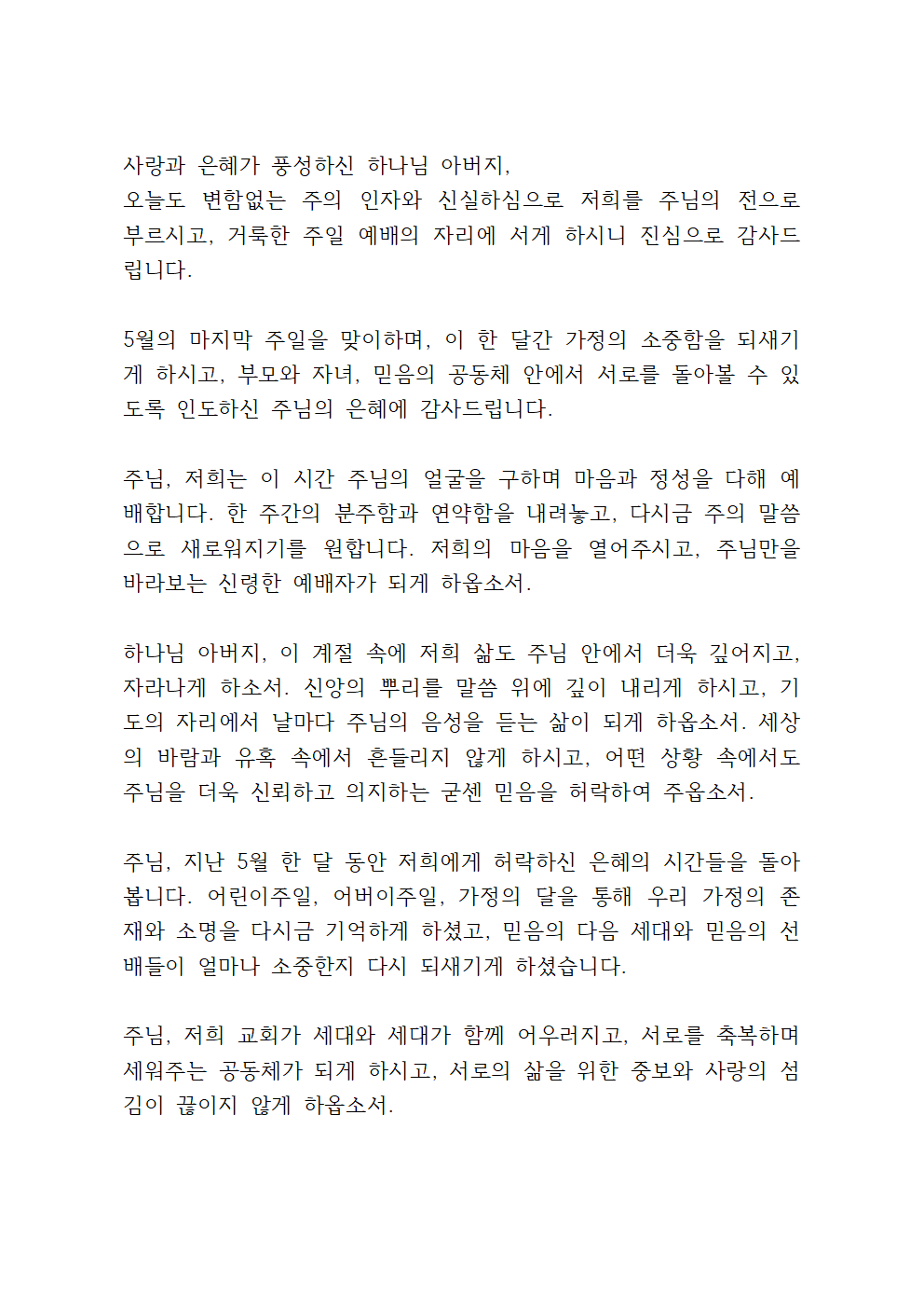 5월 넷째 주일낮예배 대표기도문 5