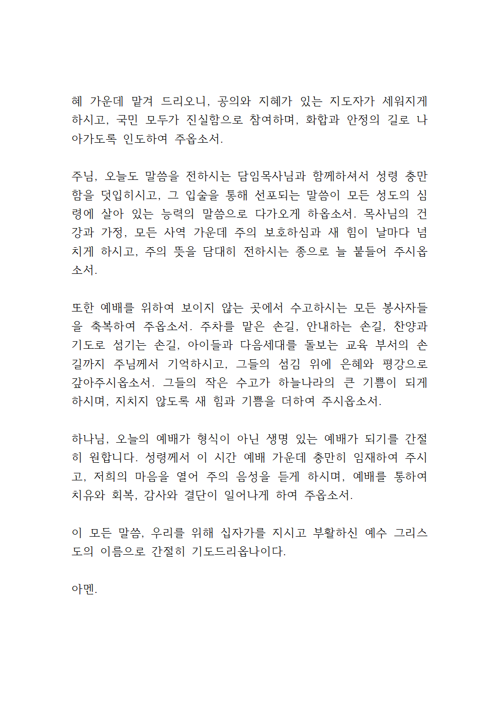 또한 예배를 위하여 보이지 않는 곳에서 수고하시는 모든 봉사자들을 축복하여 주옵소서. 주차를 맡은 손길, 안내하는 손길, 찬양과 기도로 섬기는 손길, 아이들과 다음 세대를 돌보는 교육 부서의 손길까지 주님께서 기억하시고, 그들의 섬김 위에 은혜와 평강으로 갚아주시옵소서. 그들의 작은 수고가 하늘나라의 큰 기쁨이 되게 하시며, 지치지 않도록 새 힘과 기쁨을 더하여 주시옵소서.