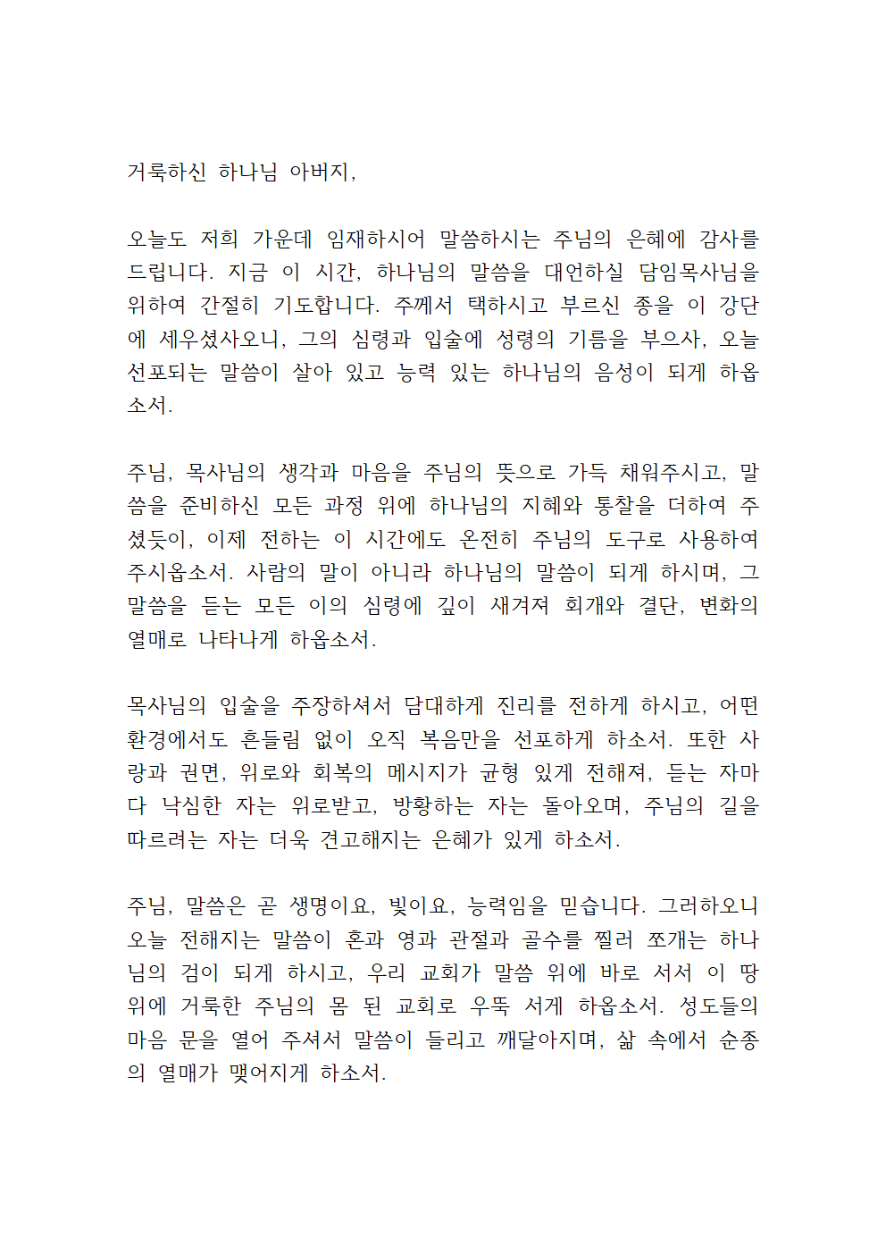 사랑하는 담임목사님을 주의 은혜로 덧입혀 주시기를 간절히 원합니다. 날마다 하나님의 음성을 듣고 말씀을 준비하게 하시며, 선포되는 말씀 속에 능력과 위로가 충만케 하시고, 영육 간의 강건함으로 목회의 자리에서 기쁨으로 충성하게 하옵소서. 목사님의 가정도 주께서 친히 지켜주시고, 평강이 넘치게 하소서.